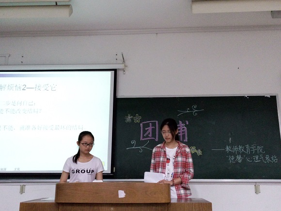 本次活动的主持人是14级汉语言师范的邵朱雨和14级历史师范的陈路昀。两位同学用她们知识扎实,谈吐幽默,生动地向大家讲解有关情绪控制的知识,心员在轻松的氛围中聆听。