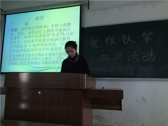 还没到活动正式开始的时间时,社员们已经陆陆续续的来到了活动教室。一开始,社长便为大家讲解了相关的礼仪知识。关于迎宾时所要注意的地方以及颁奖时的注意事项。图文结合详细的道出了礼仪的要点。当然,教学不仅仅只是去学习心得新的东西,回顾之前的以便纠正进而改善。所谓温故而知新。社长带着大家回顾了上学期大家所学过的礼仪知识和参加过的礼仪活动,一方面是为了回顾礼仪知识,另一方面是根据所参加的活动里出现的问题共同讨论解决。