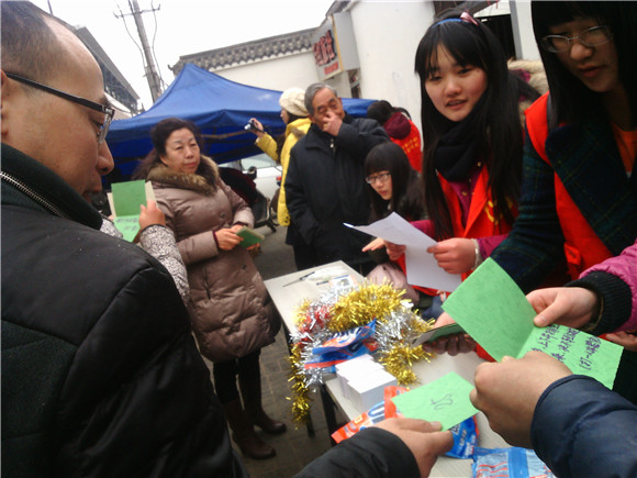 很快,来往的市民和行人被吸引过来,开始只是好奇地凑上来看几眼,志愿者们立即给围观者分发谜语,这一看,大家纷纷不自觉地停下脚步,皱眉苦思,还和身边的人一起讨论,不论是认识的亲朋好友,还是陌生的路人,不论是孩子,年轻人,还是老人,都三三两两地聚在一块,思考谜底。志愿者们准备的谜语也非常有趣,如“甘愿饿肚子(打一字)”、“去掉一半多(打一节日)”等等,不管是猜出谜底换得奖品的,还是猜不出来凝思苦想的,大家的脸上都洋溢着笑容。一旁还提供为市民们写明信片和寄明信片的活动,一时热闹非常,一片欢声笑语。