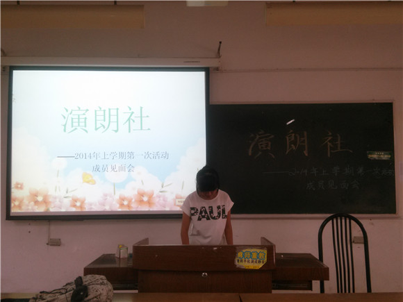 因为尚未进行正式的招新,所以本次活动并没有很多新社员加入。但是,演朗社社长陆宇庆还是为第一次活动做了充分的准备。在活动正式开始前,社长首先放了一个方言版《三傻大闹宝莱坞》的搞笑视频调节气氛,现场的氛围马上变得轻松活跃起来。接下来,就由新进的社员做了一下简短的自我介绍,让初次见面的社员先彼此熟悉。接下来,社长通过PPT具体介绍了一下演朗社是什么以及在之后的日子里会和社员们学习哪些具体的演朗知识。