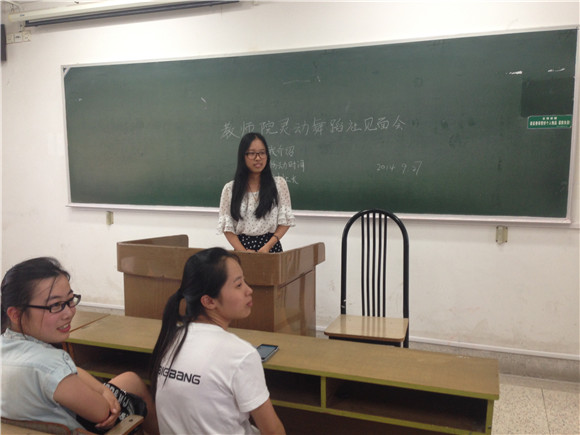 舞蹈社团热烈欢迎新社员的到来。在9月27日的新社员见面会上新社员们非常的活跃,纷纷介绍自己的对舞蹈的热爱和擅长的舞种,见面会气氛十分融洽,通过社员们的自我介绍,成员们之间都有了初步的了解与认识。社长还了解到,有一部分社员有一定的舞台经验和舞蹈基础, 鉴于此情况,社团将会对没基础但对舞蹈有兴趣的社员进行舞蹈培训,并对有基础的成员进行成品舞的排练,所以最终决定每周分为两个班次进行培训。 询问大家意见以后,将社团活动时间定在周一晚基础班和周五晚成品舞班,并且每个班为迎新晚会提供两到三分钟的开场舞节目。