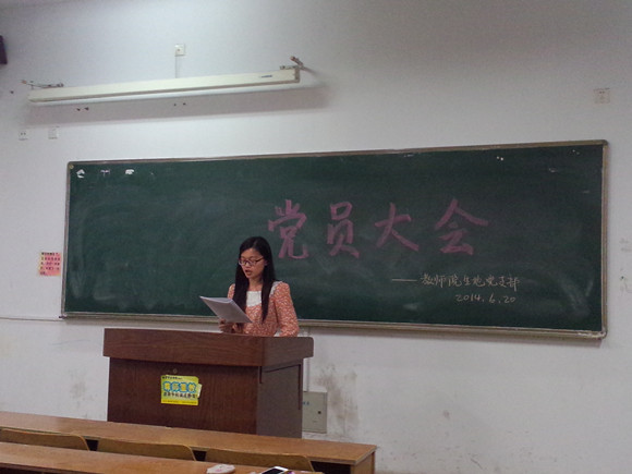 大会最后,支部书记钱琳玲对此次发展和转正的党员表示祝贺,并带领在场的预备党员和党员同学欢送了2010级的党员学姐们,祝福她们一路顺风。在场的预备党员和党员同志们表示一定会继承学姐们的先锋带头作用,为生物地理联合党支部作出自己的贡献,让生物地理联合党支部发扬光大。