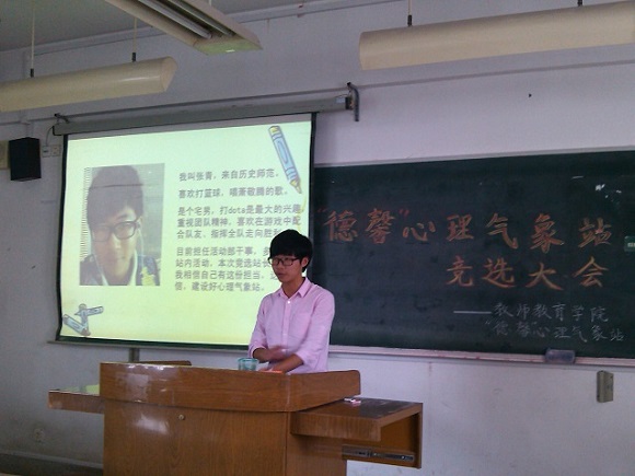 首先进行的是站长助理的竞选,来自13级历史师范的张青同学发表了他的竞选演讲。自称大宅男的他,目前担任活动部干事,多次组织站内活动。爱打篮球、唱萧敬腾歌,兴趣广泛。此次竞选站长助理,他相信自己有这份担当和自信,加强心站的团队精神,带领好组织,建设好心站。当被评委问及如何调动心站成员参与活动的积极性时,有着活动经验积累的他应答自如,从活动的组织样式到人员的参与要求,逻辑清晰,示展出了领导好心站的决心和能力。