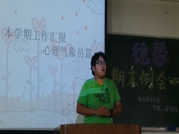 会议的第二项议程是一学期工作汇报。首先心站活动部、文秘部、宣传部副部长分别对本学期部门内的工作进行了总结。一学期以来心站举办了多次活动,文秘部写策划、通知同学,宣传部画海报宣传活动、写新闻稿,活动部主要组织具体活动的开展,各部门分工明确,互相帮助,共同促进活动的顺利开展,虽有不足之处,但在今后的工作中定会努力完善。其次,13级汉语言师范心理气象员薛梓文和12级英语师范心理气象员吴鑫萍关于心理气象员的工作进行总结。心理气象员也是心站不可分割的一部分,心站的活动需要心理气象员的宣传和积极参与。最后,站长陈铭玉进行工作总结,对一学期活动进行了回顾,并提出了对秋学期的展望,希望能吸收新成员,让“德馨”心站充满新鲜血液,发展的更好。