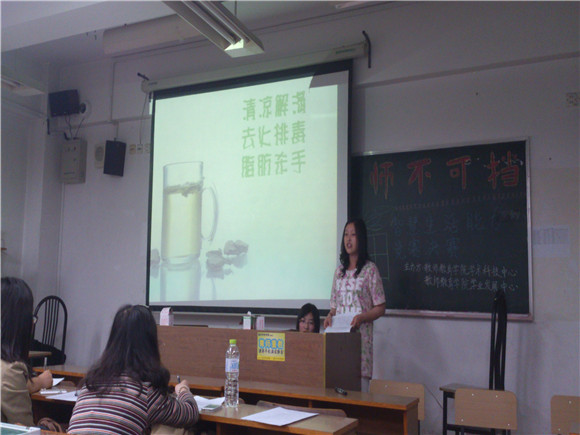 在第一轮有问必答环节,各小组同时依次作答15道选择题,在限定时间内写好答案并举出黑板,再由主持人公布答案。本环节考察同学们的生活知识积累,有三组同学均答对8题,表现优异。第二轮则是“火眼金睛”环节,每小组出一个论断并进行阐述,其他小组至多问完一个问题后判断其真假,主持人在大家亮完题板后宣布结果。第三关则是智慧生活小展示环节,13级物理师范的同学们向我们展示了叠衣板,12级英语师范的选手阐述了起床后喝水的好处,当然还有厕所神器的原理介绍,不同茶水的简介以及生活小窍门的传授,选手们在向大家展示的同时也从其他组身上学到了更多的生活知识。