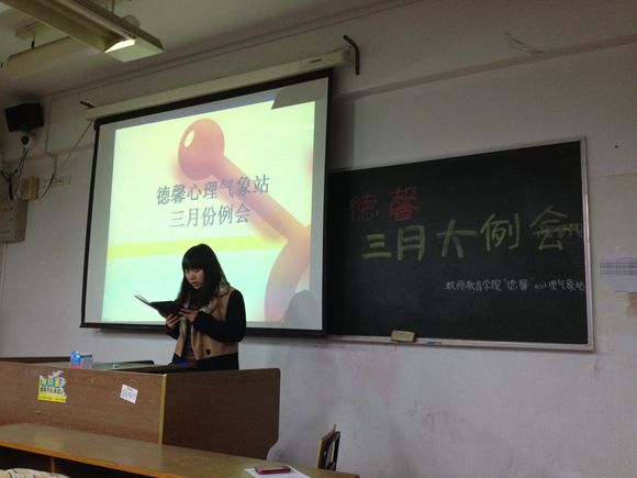 本次会议的召开主要是介绍德馨心理气象站下一阶段即将举办的活动,并部署相关工作。会议分为两个部分,首先副站长郑妍同学针对心理气象员的工作进行详尽的阐述。针对2013级心理气象员开展的团辅工作,她指出在活动过程中可能出现的问题以及注意事项,并提醒13级各班心理气象员推进“回忆童年”主题班会,要求整理好班会影视,图片以及文字资料。然后谈及心理晴雨表的填写和上交,要求大一,大二及大三各班必须每周按时填写并及时上交给对应各年级辅导员审阅,使工作开展起来更加有效,足见博彩网址大全