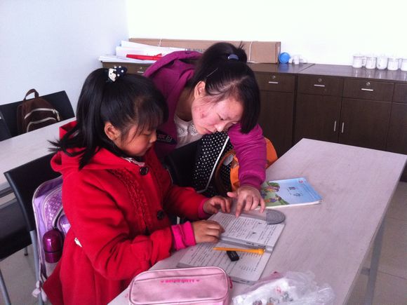 随着教室里的孩子越来越多,声音也渐渐嘈杂了起来,这时志愿者便让孩子们不要讲话,安静写作业。志愿者徐泽同学,会在小朋友写完作业后检查作业是否有错误并且指出错误教孩子改正。