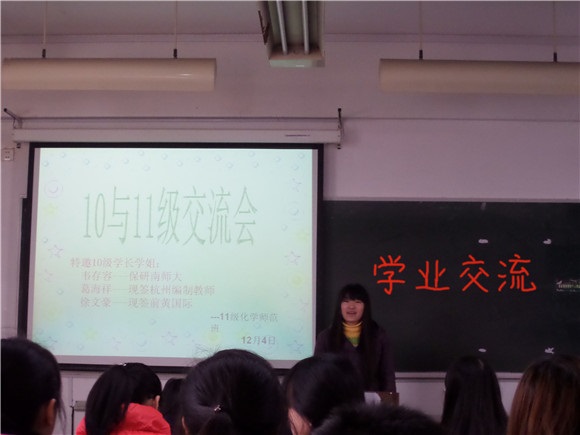 活动开始,首先由葛海阳学长为11级同学讲述师范类化学的学科科目,并把自己的选课经验与大家分享。接着又叙述了自己考编的过程,葛学长现已进入杭州编制教师行列。他强调对化学课本的研究,并希望大三的学弟学妹们在空闲的时间里多多研究中学的教材,争取有自己的思考,这对今后的比赛或是考试有很大帮助。