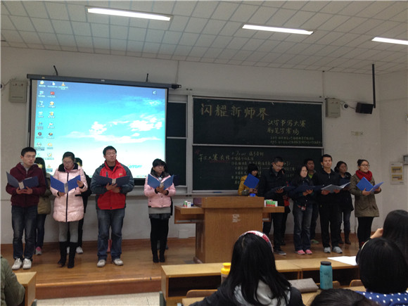 于仙林校区学明楼201教室进行“闪耀新师界”汉字书写大赛团体赛抽签仪式。抽签过后,由教师院社团演朗社和合唱队带来精彩的开场表演。
