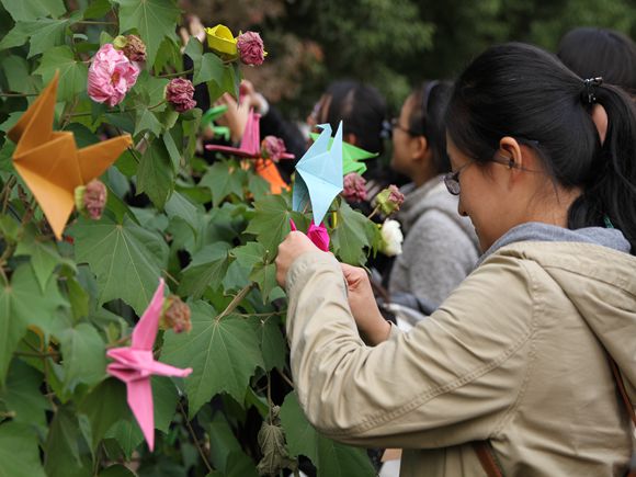 接下来进行的是本次活动的重头戏——理想树。团支书、宣传委员和组织委员向大家分发彩纸,大家把愿望写在纸上,并充分发挥自己的想象将彩纸叠成各式各样的造型,有千纸鹤、小船、衣服、爱心还有皮卡丘……紧接着同学们一起漫步到月亮湾旁边的草坪前,将叠好的愿望彩纸挂到大家一起选定的愿望树上。很快书上便被挂满了形形色色的折纸,五彩缤纷的愿望彩纸将绿树点缀的更加美丽。最后同学们一起在理想树下合影,团日活动圆满结束。