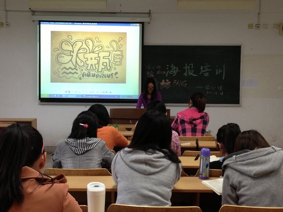 讲到字体时,王珠君同学亲自在黑板上进行演示,于是一个个规整的方块字在她的笔下变得生动起来,仿佛有动作有表情似的。她还拿出一些创意字体供大家分享,新奇别致的设计让在座同学深感耳目一新。甚至有的同学跃跃欲试,想要亲自动手设计字体,现场气氛十分活跃。这无疑使本次培训的效果大大增强,相信通过后期的练习,同学们在日后画海报的过程中也能够将这些字体变换的小技巧灵活运用。