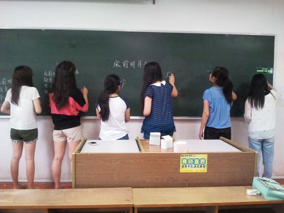 与此同时进行的还有毛笔字的练习。几个同学在黑板前一字排开,选择了《静夜思》这首古诗作为书写的文本。由于粉笔质软,在书写过程中有所损耗,所以部分同学感到“写出来的粉笔字像面条一样软绵绵”。张晟源同学认为,如果能够正确把握粉笔的柔韧性,写好板书就不难。说罢,她便捏起一支粉笔上前示范,“‘撇’要有力度,‘捺’要有回锋”,她一边写一边向两边的同学讲解道。通过张晟源的示范,几位同学按照新的方法进行尝试,虽然力度欠佳,但已基本合乎规范。