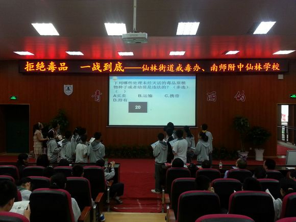 活动尚未开始,仙林中学的初一同学们就井然有序地进入报告厅并入座,参赛选手们也在台上按照班级顺序排好了队,每个人都跃跃欲试,希望能大显身手。比赛在主持人王康和薛亚楠同学简洁的开场白后正式开始。由于题目难度不一,有些同学抽到了难题答不出,只能遗憾离场;而抽到简单题的同学有些会凭自己的常识去回答,但是一些看起来是对的句子,其实是错的,于是又有一批人淘汰了。比赛竞争十分激烈,每个同学的脸上都显现出谨慎的表情,生怕自己“一错题成全班恨”。台下的同学也紧张不安,总有人在下面偷偷地喊自己认为的正确答案。经过第一轮的考验,到第二轮时,台上仅剩下了六个人,比赛更加激动人心了。初一7班只剩一个小姑娘了,但她还是坚持奋斗到了最后,当她因答错题目下场时,台下的同学们都感到十分惋惜。经过十分激烈的争夺,最终,初一年4班勇夺第一,7班屈居第二,1班获得季军。比赛结束,栖霞区禁毒委员会办公室许警官和仙林中学党委黄书记分别为本次活动参赛的同学颁发了奖项。