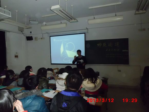 活动还未开始,教室便已座无虚席。首先,由11级英语师范的徐江涛同学给大家上了一堂趣味横生的关于“animation”的英语课,用熟练的口语介绍了动画的制作过程,其间穿插了一段获得第85届奥斯卡最佳动画短片奖的《Paperman》 ,给大家留下了深刻的印象。下面上场的程娟同学则另辟蹊径围绕词汇记忆方面说课展示,在最后进行了观众互动,3位同学加入猜词活动,成功地调动了现场的氛围。最令大家啧啧称赞的莫过于11级物理师范的黄然同学关于《物理史话》的展示,他用生动风趣的语言将深奥的物理与生活相联系,带领大家一起探索物理学的内涵与魅力,博得了大家的热烈掌声与一致好评,更有同学感言说“和我们以前的物理老师一样风趣幽默”。最后,由姚亚楠和王三山同学分别就“看美剧学英语”和“礼貌英语口语”向大家说课展示,语言清晰,贴近生活。