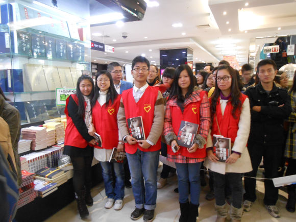 活动当天,天气寒冷,但凛冽的冬风吹不走志愿者们的热情。尽管互动签售会在下午两点举行,但是中午十一点志愿者们就已经到达凤凰书城一楼的活动现场,为志愿服务做了充足的准备。志愿者负责人邹莹同学与书城活动负责人积极联系,及时明确了志愿者们的任务,并叮嘱志愿者们,由于签售会气氛活跃,所以要一定控制好自己的情绪,保持镇定,坚守自己的职责。