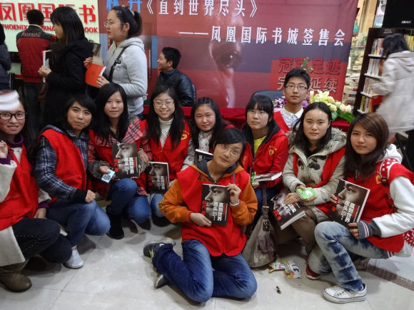 时间一点点过去,书城里的林丹球迷也越来越多。中午十二点,志愿者们跟随书城负责人进入签售会现场。按照工作人员的要求,志愿者们必须维持签售会秩序,及时阻止突发或意外事件。在球迷们排队等候的过程中,志愿者们尽心尽责;在球迷想要逾越护栏时及时进行了阻止;在球迷抱怨时适时地进行安慰。下午二时,林丹准时出现在了签售会现场,现场球迷激动万分,志愿者们配合书城工作人员维持现场秩序,并安排球迷们五人一组,排好队伍进行互动签售,使得活动有序而高效地进行。签售活动结束后,志愿者们集合留影纪念,脸上都挂着胜利的笑容。