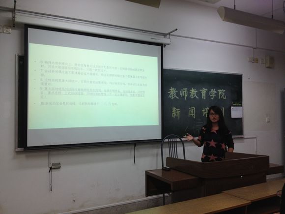 接着,吴芳园主任向同学们概述了新闻种类与结构方面的知识,让同学们对新闻的分类情况及构成方式有了初步了解和认识。她向同学们具体阐明了在进行导语写作时运用渲染式构文方式的详细方法及其优越性,对同学们今日后的新闻创作大有裨益。随后,吴芳园同学为同学们简要说明了新闻语言的特点。她表示:新闻语言兼备客观、确切、简练、朴实、通俗等特色,写作时切忌主观随意性。此外,吴芳园主任还为同学们讲解了新闻角度与新闻素材方面的专业知识,使同学们新闻写作的知识储备更为全面。