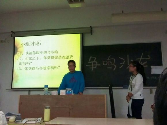 然后,活动进入了讨论“幸福”的部分。同学们先观看了清华“学霸”马冬晗的特别奖学金答辩视频,并分组讨论观后感想。在大家兴致高昂的讨论声,活动的气氛也愈加热烈,“争鸣”二字得以充分体现。经过一番讨论后,几位同学上台浅谈了自己的感谢。对于“你幸福吗”事件,主持人初琳琳认为农民工的反应表明他清楚自己同记者不是一个话语圈的人,没有共同话题。而后11级金震川侃侃而谈,激情昂扬的阐述了他对此事的一些看法。最后大家一致认为:每个人对于幸福的定义不同,对“你幸福吗”一问的回答也不尽相同,因而孰是孰非也就不能一概而论。此后,大家又就如今很热门的诺贝尔奖得主莫言受访一事展开交流,部分同学也陈述了自己对幸福二字的理解。