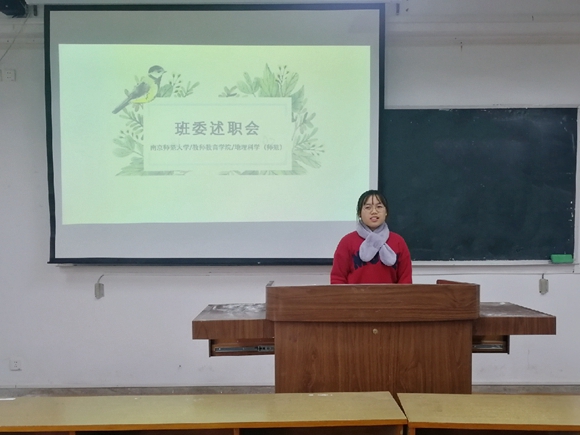 2017级地理师范班在仙林校区学明楼304教室举办本学期末的班委述职班会,此次班会活动由班长梁萍主持,生活委员林燕萍进行物资采购,班级全体成员参加。