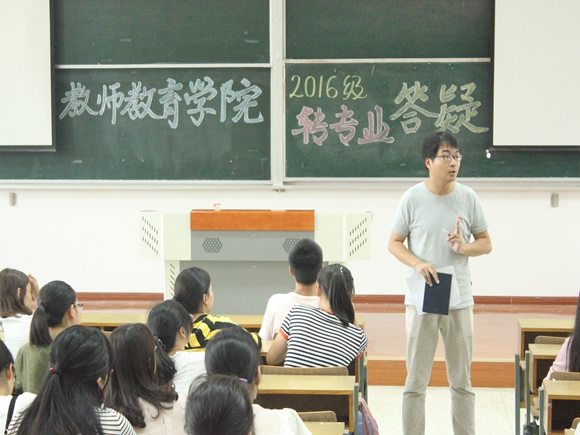 的分工职责等进行了较为详细的说明,对教务管理以及其他事务进行了归类,方便同学们更加好的在教师院学习与生活,特别提醒了同学们的转专业学分换算问题。对于一些细微的事情,过老师也是耐心讲解,为了进一步密切转专业同学以及交换生和我们16级同学的关系,他向同学们推荐了16级教师院总群、文理科群组、以及专业学科的纵向群,利用网络平台,更好的贴近了同学们的生活。最后过老师着重强调了大学生言论问题以及希望同学们做一个诚实的师院学子。