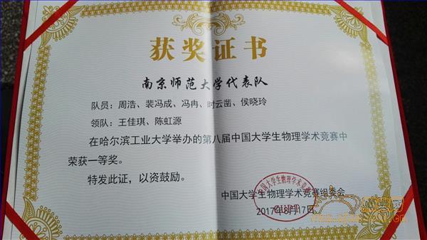 8月13至18日,2017第八届中国大学生物理学术竞赛(CUPT)在哈尔滨工业大学举行。本届竞赛共有73所高校(其中包括全国39所985学校中的32所)派出的74支代表队参赛,另有27所高校派队观摩,师生人数逾千人,可谓精英云集。南京师范大学2017CUPT代表队荣获团体一等奖。