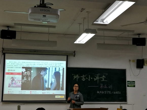 “师言”小讲堂第五讲在仙林校区学明楼210教室成功举办。本场讲座由学院16级团总支副书记张志伟主持,邀请到了16级数学师范班冯心怡同学为大家带来主题为“霸道总裁文,套路之外的套路”的精彩讲座。“师言”小讲堂是教师院16级团总支为培养学院16级同学们的课外实践能力,丰富师范生的课堂实践内容,锻炼大家的表达能力而举办的系列讲座活动。本次讲座中,冯心怡同学的主题鲜明、内容新颖,受到了同学们的一致好评。