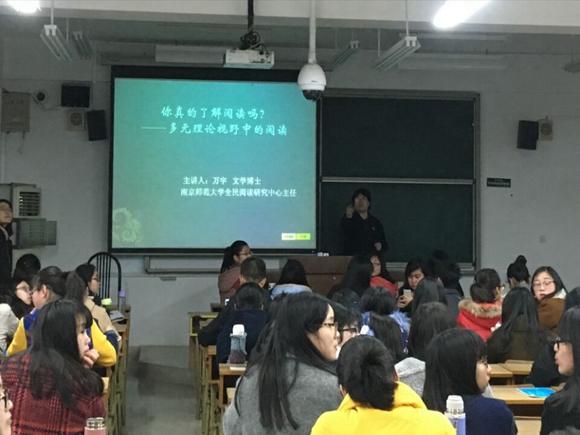 3月16日晚在仙林校区学正楼408教室,万宇博士开展“你真的了解阅读吗——多元理论视野中的阅读”专题学术性讲座,16级汉语言文学师范班同学们纷纷慕名而去,讲座现场座无虚席,更有本班同学在教室后面听讲。