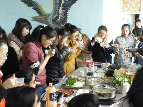 上午八点,所有人都在西门集合,坐车去活动的地点,在负责人简单介绍后,大家便分开找各自喜欢的地方。有尽三分之一的人进了唱歌的包间,一部分人留在客厅玩游戏,还有的玩密室逃脱游戏,王琳、朱潇逸、王玥莹、陈露等七八个同学将买来的零食分给大家,并开始辛苦准备午餐食材,将肉类用各种调味料腌制备用,火锅食材分类放好。还有同学两三一组的下象棋、飞行棋,打台球,打麻将等等。午餐是围在桌台边吃的,尽管桌子不小,可仍坐不下,只有站着走动着吃,而班长她们几个仍在忙碌着,向桌上端吃的。吃完后,也已近两点了,在简单几轮游戏,几首歌,又或是一支舞后,接的车就来了。