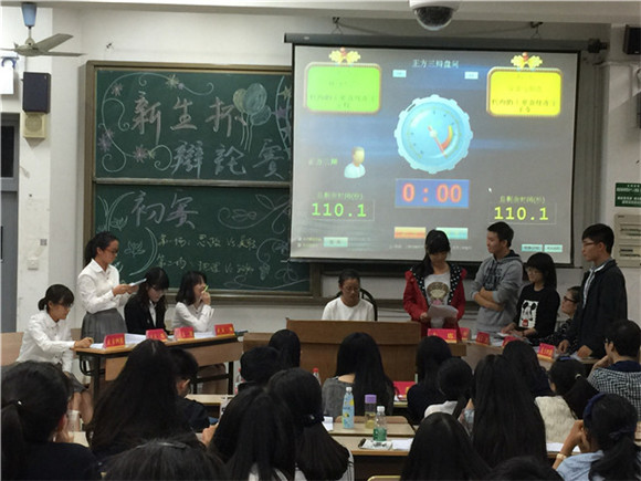 于南京师范大学仙林校区学海楼310教室举办“新生杯”辩论赛第一节。共有四支队伍参加了本节辩论赛,分别来自思想政治教育师范、英转师范、地理科学师范和汉语言文学师范四个专业。邀请到了徐丽菲、袁佩瑾、张宁、林洁心、宋珂芸五位同学作为本节辩论赛的评委。