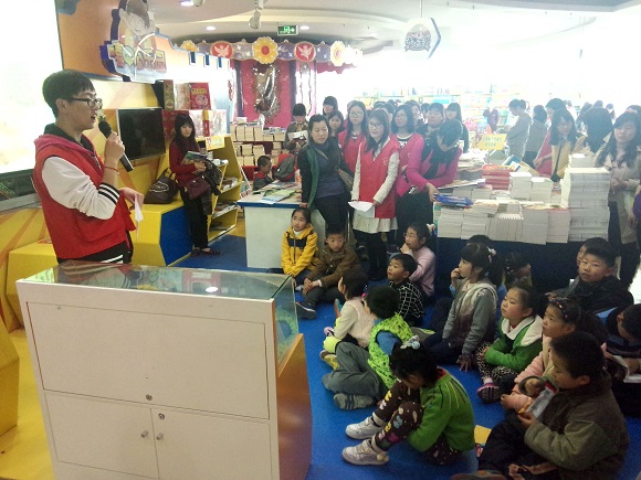 活动当天,书城的孩子们一听闻有南师大志愿者们的特别宣讲,便放下手中的书,有秩序迅速地围坐成几排,等待活动的开始。此次宣讲活动分为志愿经历分享、社会主义核心价值观主题朗诵和书籍推荐三个部分。一开场,主持人李玉杰同学便凭借其亲切幽默主持风格吸引了孩子们合家长们的注意力。其中,最受欢迎当属来自13级英语师范的张晗同学与大家分享的青奥志愿服务经历的环节。在她的讲述下,观众们仿佛也置身那样一个挥洒着青春和汗水的青奥后场,孩子们也听得津津有味,更有男生大呼“我以后也想做一名青奥志愿者!”