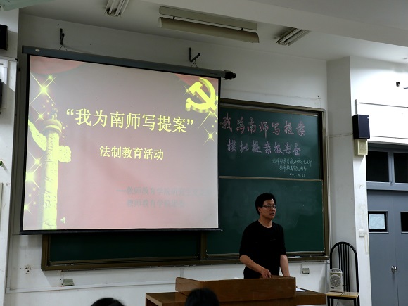 “我为南师写提案”模拟两会提案报告会在仙林校区学海楼212教室隆重举行。院党委副书记江胜尧、团委书记支景、团委副书记李晓亮、王鑫以及辅导员王瀛、孔晖、殷志伟等老师担任了评委,100多名本科生和研究生参加了报告会。报告会由院团委干事李好主持。