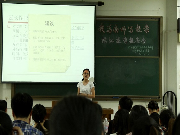 报告会首先是提案汇报环节,八组提案人代表依次上台作提案报告。其中第2组是由14级汉语言的石婷同学和研究生郭怡、杨秀超联合发起的关于改进敬文图书馆的提案,通过对比国内其他高校图书馆情况和汇总问卷调查,分析了我校图书馆现状,从更新电子阅览室、延长开放时间、完善管理等三个方面提出了建议。第6组来自14级生物学科教学的研究生虞梦琦、高瑞萍则从现状、可行性分析、实施办法等三个方面介绍了为校仙林校区植物挂牌的提案,构建绿色生态校园。