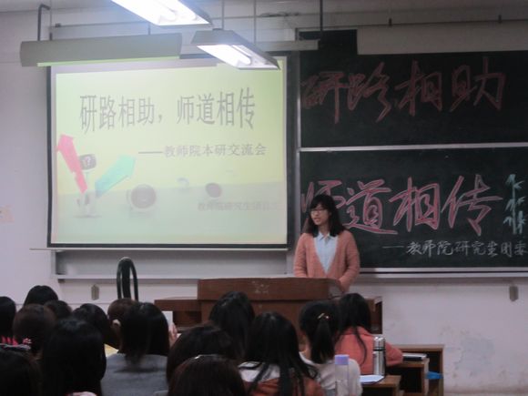 历史专业的沈婷同学跟同学们交流了跨专业考研应该怎么做的问题,她鼓励大家要坚定信心,认为考研是付出和回报很成比例的一件事情。英语专业的骆嘉璐同学主要给大家详细讲解了教育学综合应该如何复习,选用哪些资料,她说能背的问题就不是问题,谋事在人,成事在天。教师教育专业的王捷则给同学们介绍了教师教育专业的前景,分享了一些考研的心得体会。
