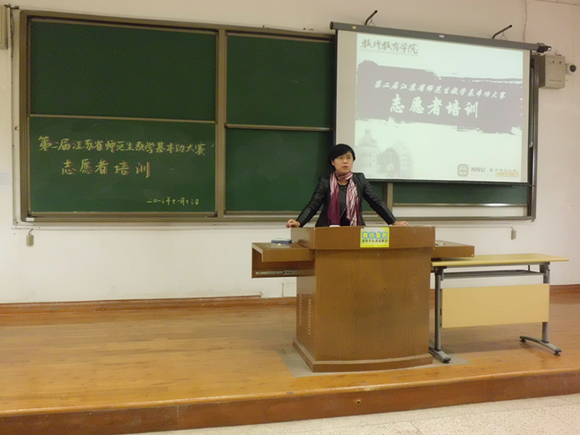 首先周晓静老师向大家简单介绍了此次大赛的性质、内容以及志愿者的分组概况:在本次大赛中,志愿者被分为专家组、竞赛组、宣传组以及会务组。周老师表示:同学们应当根据各自不同的工作灵活应变,例如专家组的志愿者应特别注意工作的保密性和严谨性;会务组的志愿者应做到服务的热情和周到。紧接着,朱冬梅老师再次强调了本次省师范生教学技能大赛的重要性。她向同学们强调了以下四点:一是责任,志愿者须注意自身的责任与外在形象,应做到言谈举止合理、穿着整洁大方;二是守时,志愿者须提前到岗准备;三是高效,志愿者应提前适应环境与流程,使自己在工作过程中有速度、有质量;四是奉献,每一位志愿者都需要有奉献精神。除此之外,朱老师还强调了大家应当对自己高要求,使自己得到更多锻炼。最后,翟云秋老师宣读了具体的志愿者分组名单,并确定了志愿者们的编号。