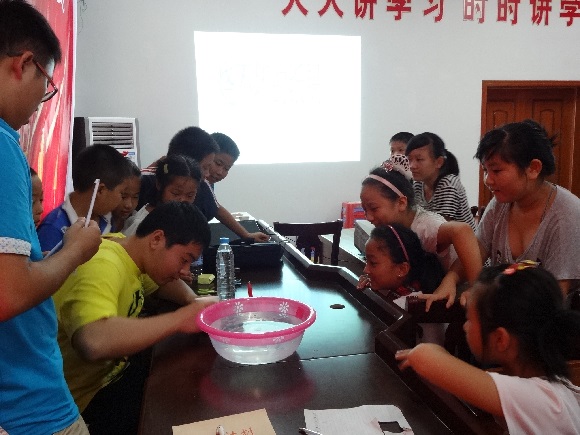 下午的活动在孩子们好奇的眼神中拉开帷幕,队员龚武坤和马久磊以四个物理小实验为孩子们展示了另一个神奇的世界。“浮在水面上的针”、“水流发动机”、“烧不坏的纸锅”、“戳不破的气球”这四个实验的成功完成使孩子们欢呼不已。此次实验旨在激发孩子们学习的兴趣,启发他们对生活中神奇现象的思考。最后的课业辅导也帮助孩子们解决了不少课业问题,提高了孩子们学习的能力。
