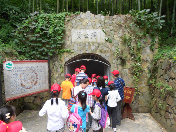 首先,导游带领同学们到达了入口处石壁雕泉景观。随后,参观队伍来到了雷公洞,在进洞参观之前,导游向同学们介绍了雷公洞的性质以及参股的注意事项。雷公洞是一个裂隙式溶洞,主要是石灰石和白云岩的碳酸类岩石,由于溶洞内狭窄奇险,曲折幽深,起伏较大,更有深不可测的水潭,所以同学们在参观时一定要注意安全,紧跟队伍,注意脚下岩石的湿滑,同时注意不要撞到头顶的岩石。在洞内,3位志愿者分别于队伍的前中后协助老师维持秩序,照看小朋友的安全。