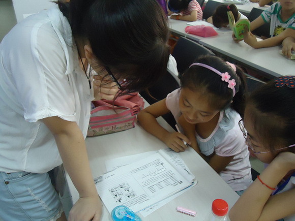 “百善孝为先”的德育小课堂以一曲《父亲》告结。随后,“幼吾幼以及人之幼”——关注亲子关系与教育暑期社会实践小队的成员们根据各自的专业优势对孩子们的课业进行了辅导,在整个教室了萦绕着浓厚的学习氛围。