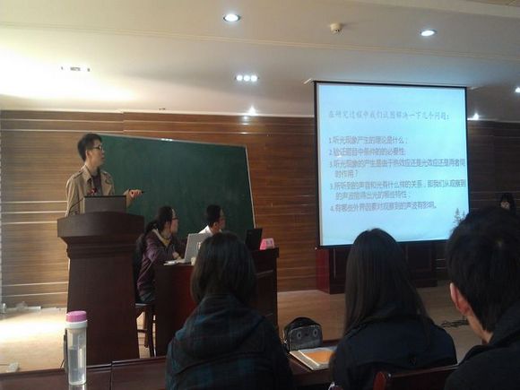 在他发表完正方观点之后,比赛进入到提问环节。反方主控冯思宇同学根据正方的报告内容有针对性地向正方提出问题。提问过程中,冯思宇同学据理力争,寸步不让,观众们纷纷对反方同学表现出的气魄表示了赞赏。在第三部分的讨论环节,比赛进入了白热化阶段。正反双方的主控针对听光现象的理论解释、实验细节部分进行了详尽的讨论。通过讨论交流,使双方对这个问题有了更加深入的理解。