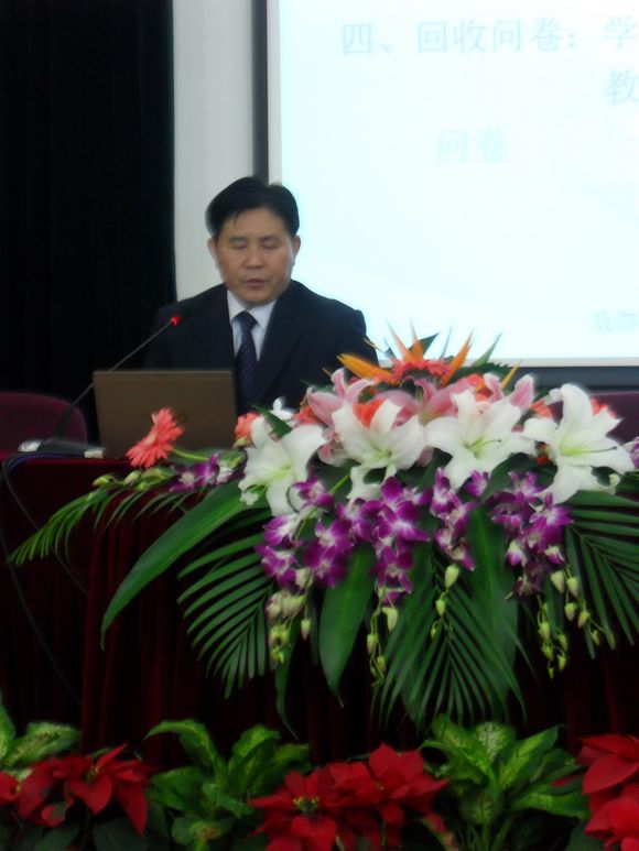 来自溧阳的芮副局长曾经担任过溧阳市外国语学校校长,他把在小学生中做的问卷调查的结果展示给大家,他睿智的语言赢得了全场同学的赞叹。他根据数据分析,孩子们心目中的好老师应具备:温柔、幽默、严格、漂亮、公平公正,让大家会心一笑。此外,他强调了作为一名教师,价值取向、情趣、人格、勇气亦不可或缺,以他个人经历阐释了对教师形象的理解。