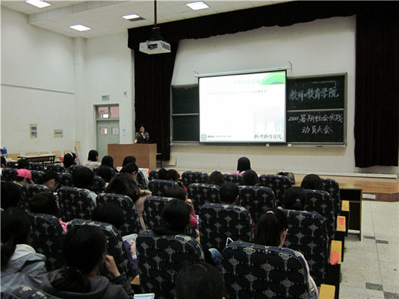 在仙林校区学海楼111教室召开2011年暑期社会实践动员大会。出席本次大会的有教师院党委副书记朱冬梅老师、团委书记支景老师、辅导员李晓亮老师、翟云秋老师。本次大会还特别邀请物科院丁一娟学姐、文学院吕超学姐、朱一闻学姐参加,会议由院团总支书记刘颖同学主持。全体同学准时参加了动员会。