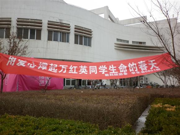 2月27日, 初春的天气还带着些许凉意,冬日的寒冷仍旧呼啸在校园。然而东区食堂门口一条“撑起万红英同学生命的蓝天”的红色条幅让步履匆忙的同学们停下脚步,为数科院身患重症的万红英同学奉献自己的一份爱心。其中,博彩网址大全