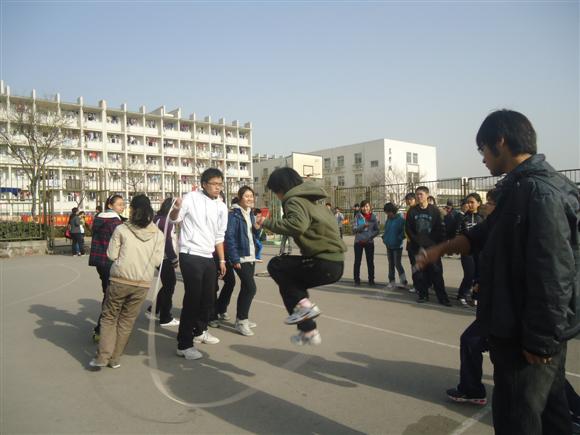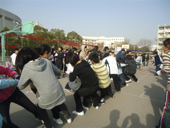 一条粗长的麻绳维系着两支不同的队伍,却是同样的饱含力量,充满热情。一声令下,拔河比赛开始。深蹲向后的姿势,抿嘴咬牙的表情、整齐划一的口号,颇有些“力拔山兮气盖世”的风范。决赛中,历史班对战化学班被裁判田哲同学戏称为“文理大战”,最终历史班以压倒性优势战胜了化学班,夺得冠军。