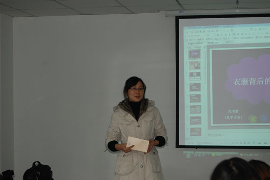 沈书君同学从我们熟知的衣服的材料入手,运用其出色的语言表达能力以及与同学间的互动,讲授了衣服材料的相关组成,并且对时下的衣服材料进行说明,详细解释了天然与合成之间的优缺点,普及了纤维材料的化学知识,教授爱美的女生如何根据需要选择正确材料的衣服,受到广大女生的热烈欢迎。