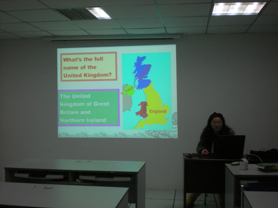 首先,孟天同学结合生动形象的PPT展示和视频资料,向大家全面介绍了英国的地理概貌、政府机构、食物、节日、音乐、体育等一些鲜为人知的异域文化。