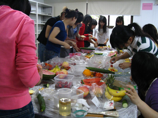 比赛过程中,各色的水果,在选手们天马行空的想象力下,呈现出不可思议的一面。不仅围观的同学啧啧称赞,就连邀请过来的评委老师们也纷纷拿出手机拍下这些新奇的作品。一阵阵欢声笑语后,作品渐渐出炉。选手们逐个对作品进行介绍,人群中不时爆发出热烈的掌声。若说选手的作品精彩至极,那他们绘声绘色的介绍就绝对是锦上添花!大家都不约而同的将主题定格在了“爱”这个永恒的话题上,有“满满的爱——相逢一醉是前缘”、“我和你——不管朋友、亲人、还是爱人之间都要从心开始,相亲相爱”、“幸福花园——老师和学生共同在幸福花园中畅谈理想和人生”等等。