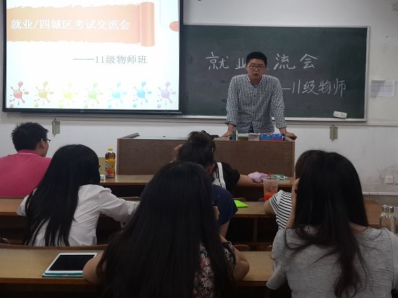 11级物理师范班在学明楼207教室召开了就业交流会,10级物理师范班的童晋学长应邀为大家介绍了就业相关的信息。