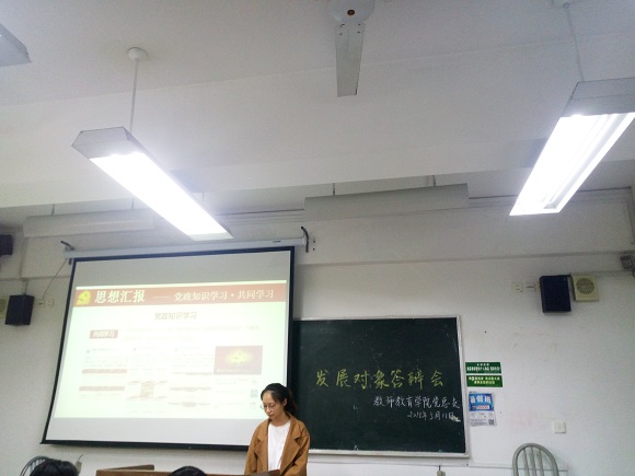 首先由党总支宣传委员肖钰敏简单地介绍之后,即开始本次的答辩。答辩依次为数计支部、物化支部、英语支部、生地支部、汉历支部及思政支部,积极分子向大家展示自己的具体情况限定三分钟时间,正式党员及各支部支委根据答辩情况负责打分。