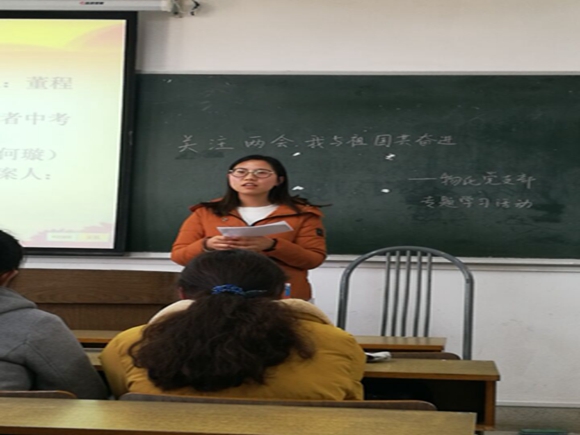 3月14日下午,物化党支部在仙林校区学明楼413教室召开"关注两会,我与祖国共奋进"专题学习活动。正式党员,预备党员32实到18;积极分子应到23,实到21。