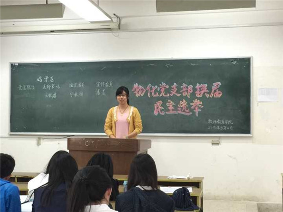 本次会议开始前,所有党员及预备党员收到通知,自行考虑准备换届事宜,考虑竞选何职位,并提前做好准备竞选演讲。会议开始,有意竞选新一届党支书、组织委员以及宣传委员的同学依次在黑板上写下姓名,让大家提前熟知、考虑,然后进行选举演讲。接着由党支委带头进行选举投票唱票。最终由12级物理师范王忆君担任党支书,12级化学师范宁秋丽担任组织委员,12级化学师范潘芸担任宣传委员。