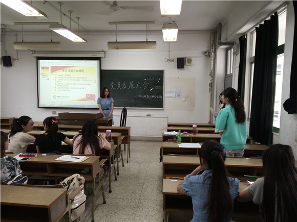 庄严的国际歌声中,全体党员肃然起立。随后,王鸯雨同学介绍了本次发展大会的具体流程,拉开了发展大会的帷幕。首先是倪雯、杨雯、刘青、陆余庆、张伊静、陈婧、蒋天娇七位同学分别向党组织汇报自己作为入党积极分子在学习、工作、生活作风等方面的表现,随后其入党介绍人介绍其在各方面的表现。紧接着,在答辩环节中,在座的党员分别向这七位同学进行提问。这七位同学也进行了相应回答并赢得了大家的一致好评。之后,正式党员们根据七位同学的表现进行了慎重的投票表决。在汇报结束之后,王鸯雨同学统计了正式党员的投票结果,并宣布了此次支部发展大会同意党支部吸收倪雯、杨雯、刘青、陆余庆、张伊静、陈婧、蒋天娇等七位同学作为预备党员。